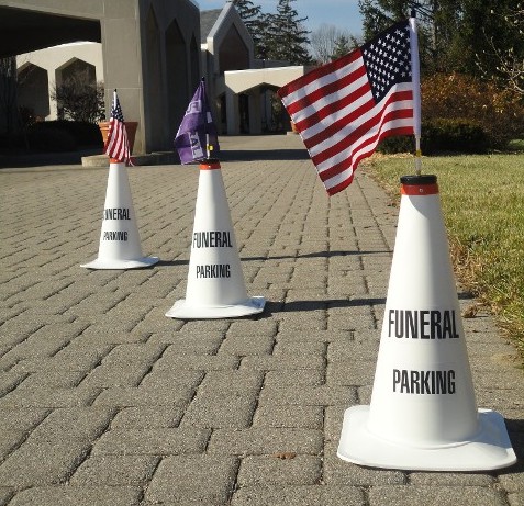 The Guardian Parking Cone provides funeral directors, churches, and cemeteries with a highly visible, distinguished, and durable marker to designate parking during funeral services. The cone is designed to be easily stacked for convenient storage and easy transportation. The parking cones are manufactured with a durable and visible orange hand grip, have a height of 18”, constructed of a solid durable plastic, and have a highly visible and refined white color with black lettering displaying FUNERAL PARKING. A distinctive feature to the Guardian Parking Cone is the manufactured flag mount on top of the cone. When a director, church, or cemetery must identify parking areas for a funeral service, a Guardian Flag and Magnetic Stand can be mounted to the top of the parking cone, enhancing what designates areas for funeral parking. When funeral services are complete, and the funeral procession is preparing to leave, the flags and stands are conveniently located on top of the cones and can be easily placed on cars so the funeral procession can get underway. The cones can then be effortlessly stacked and put away for storage or transportation for the next funeral service.